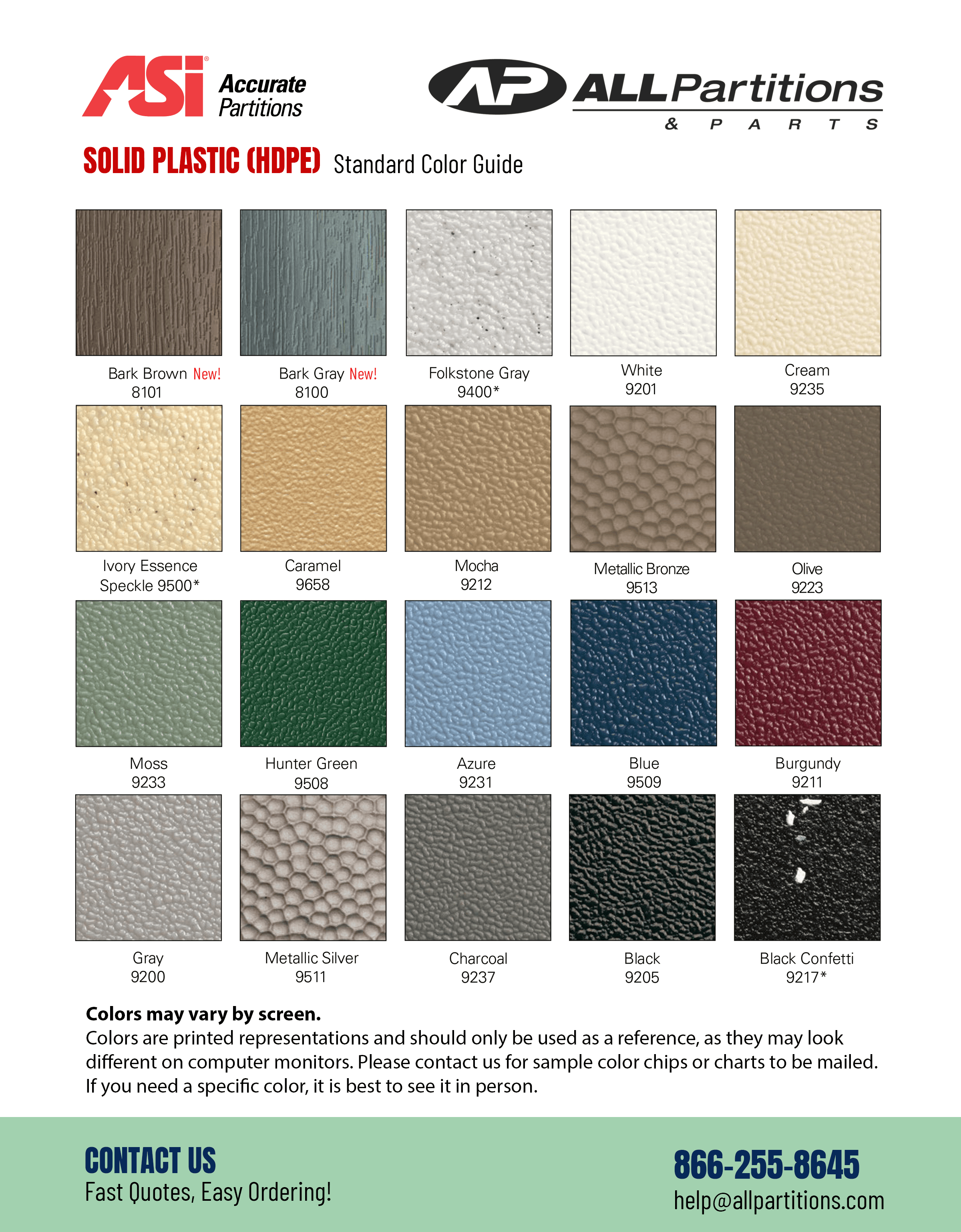 ASI Accurate Partitions warrants that Solid Plastic (HDPE) products will be free of defects in material or workmanship under normal usage from the date of invoice for Twenty-Five (25) years against delamination, breakage or corrosion.