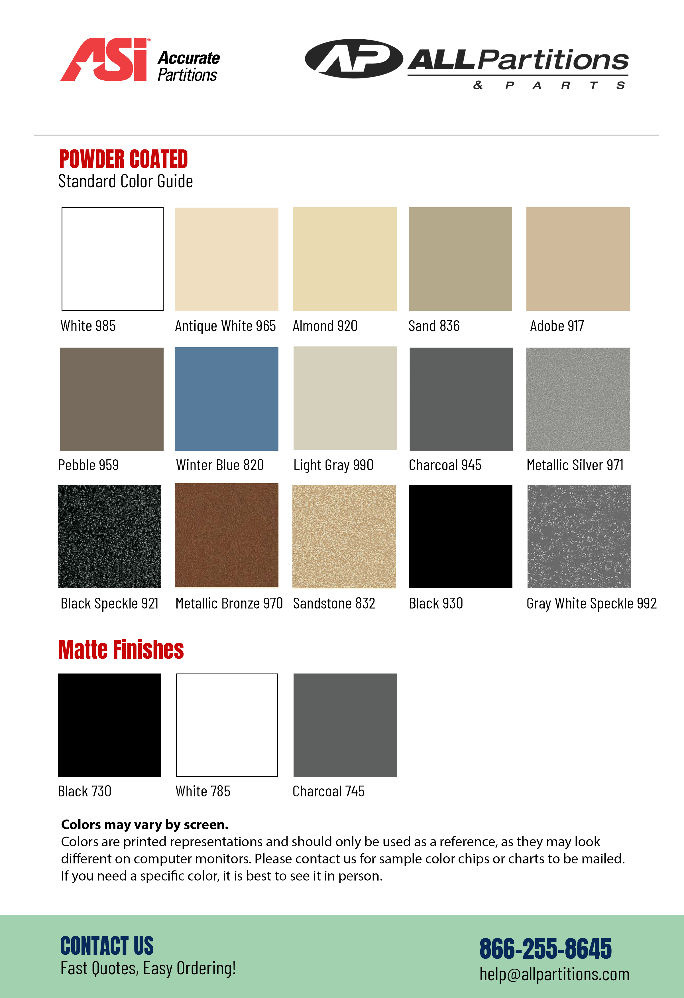 ASI Accurate Partitions warrants that Powder Coated Steel products will be free of defects in material or workmanship under normal usage from the date of invoice for Three (3) years against chipping, flaking, cracking or discoloration.