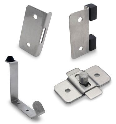 Stamped stainless steel; 1-7/8" between screws; 1/8" bar to door clearance. Use where door and pilaster are same thickness. Use A7055, A7056 and A7057 together.